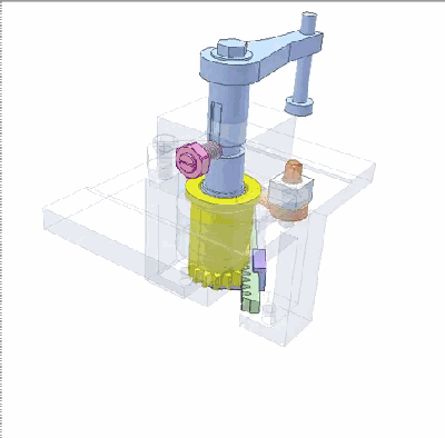 12、筒形凸轮的取放机构 橙色曲柄连续旋转,蓝条末端的真空工具拾取和放置工件,黄色齿轮和绿色齿条使黄色桶形凸轮前后转动。 由于粉色螺钉的方形端和蓝色凸轮的U形凹槽之间的相互作用,运动使得蓝色杆固定到其上的蓝色圆筒凸轮具有拾取和放置运动。 |