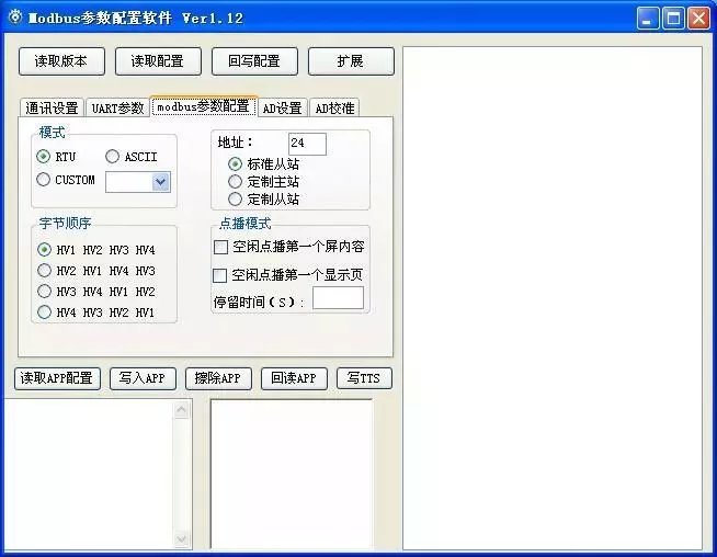 例如我要往画面编号 1 输入内容 ABCD在屏幕上显示出来, 先配置设备MODBUS参数,必须为RTU模式,从站地址24,字节顺序为1234 字节顺序具体看目标设备指定,