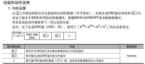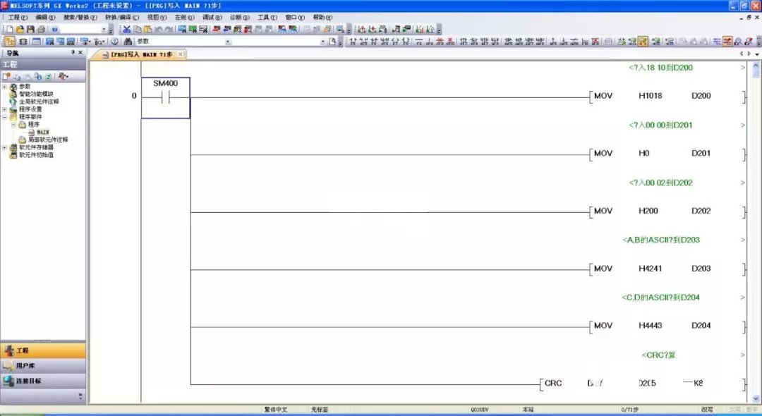 /*********************************************************/ 18 从站地址 24 10 功能码 16 写多个寄存器地址 00 00 寄存器起始地址 0 00 02 寄存器个数 8 位(画面编号1对应寄存器地址为0,占用8个寄存器共16字节,超过16字节数据会被丢弃) 41 42 AB 的十六进制 ACSII 码 43 44 CD 的十六进制 ACSII 码 C1 53 CRC16 校验码 要从PLC发送内容,先确定数据存储区,按照前面所示的数据结构,来定义数据存储区数据。本例子中从D200开始,因为数据全部是按16进制传送,要发送数据必须转换为16进制后再写入存储区,PLC发送数据是按照先低八位后高八位的顺序,所以在定义数据发送顺序时必须遵守这个原则,如下面图中程序所示: 这里重点要说一下CRC校验指令应用, 这里这个N是8位数据个数,一个D地址是16位,一定要注意, CRC指令在三菱FX-2N以上系列中被支持,但在三菱Q系列中,目前只有Q03UDV以上的CPU支持,往下的CPU只能通过梯形图编写CRC校验程序,这种例程在百度上能搜索到很多。