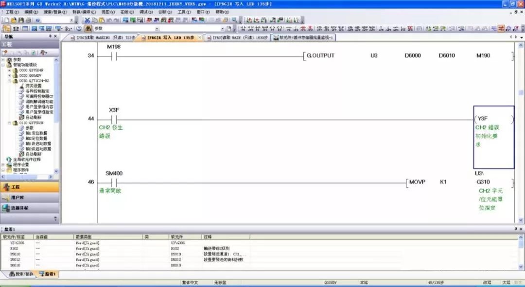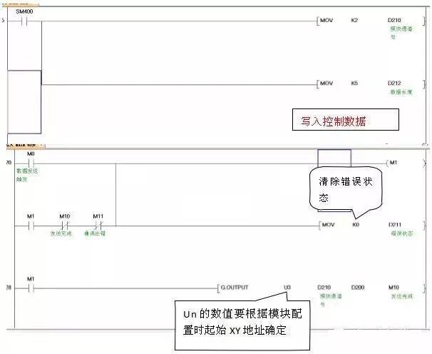 三菱Q系列数据发送使用的是G.OUTPUT指令。 写入控制数据下图为例程: Un的数值要根据模块配置时起始XY地址确定清除错误状态 程序编写完成后,要使用串行模块线路跟踪工具进行发送数据测试,具体路径在工具-智能功能模块用工具-串行通信模块-线路跟踪 查看此区域发送的数据是不是想要发送的数据,数据发送触发完成之后点停止点开始跟踪再选择通道先选择模块 在实际应用中,可能需要对数据进行整理,以下是几个常用数据处理指令 WTOB指令:字节转换为字,BTOW指令:字转换为字节。SWAP指令:高低位互换。 |