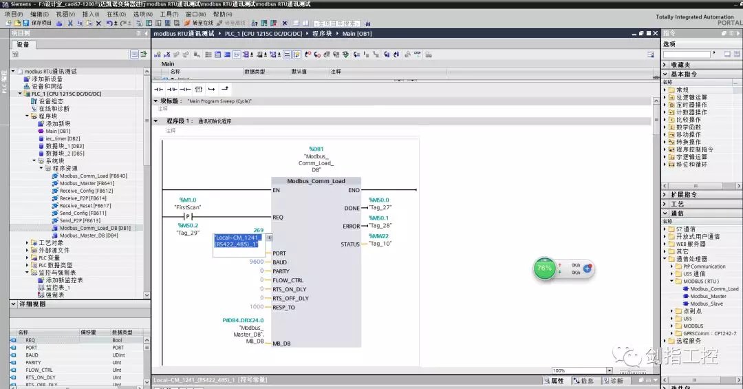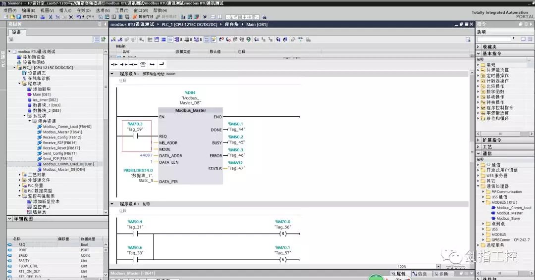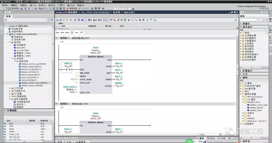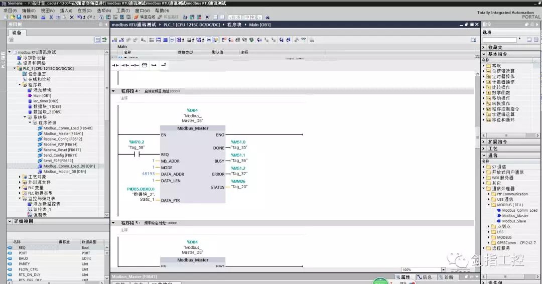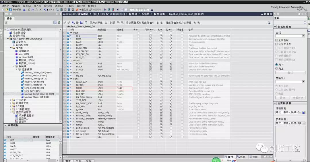 五、编写modbusRTU初始化程序 在OB1里,编写modbusRTU初始化程序,点击右侧“通信”--“通信处理器”--“MODBUS(RTU)”--“Modbus_Comm_Load”,拖拽到程序段1中,自动生成背景数据块; Modbus_Comm_Load模块的引脚说明: EN--使能端,一直使能; REQ--只在第一次扫描周期为1,且必须是上升沿触发; PORT--指定CM1241模块的硬件标识符(标注方法:如图7) BAUD--指定通讯波特率(9600); PARITY--指定奇偶校验位(0--无校验) MB_DB--指向主站生成的背景数据块的MB_DB参数; 输出引脚指定地址即可,如图6 注意:在左侧“程序块”--“系统块”--“程序资源”下拉列表中,双击Modbus_Comm_Load的背景数据块,Modbus_Comm_Load_DB,修改第19行MODE的数值,由默认值修改为16#04;如图8 0=全双工(RS232); 1=全双工(RS422)四线制模式(点对点); 2=全全双工(RS422)四线制模式(多点主站,CM PtP(ET200SP)); 3=全全双工(RS422)四线制模式(多点从站,CM PtP(ET200SP)); 4=半双工(RS485)二线制模式;
