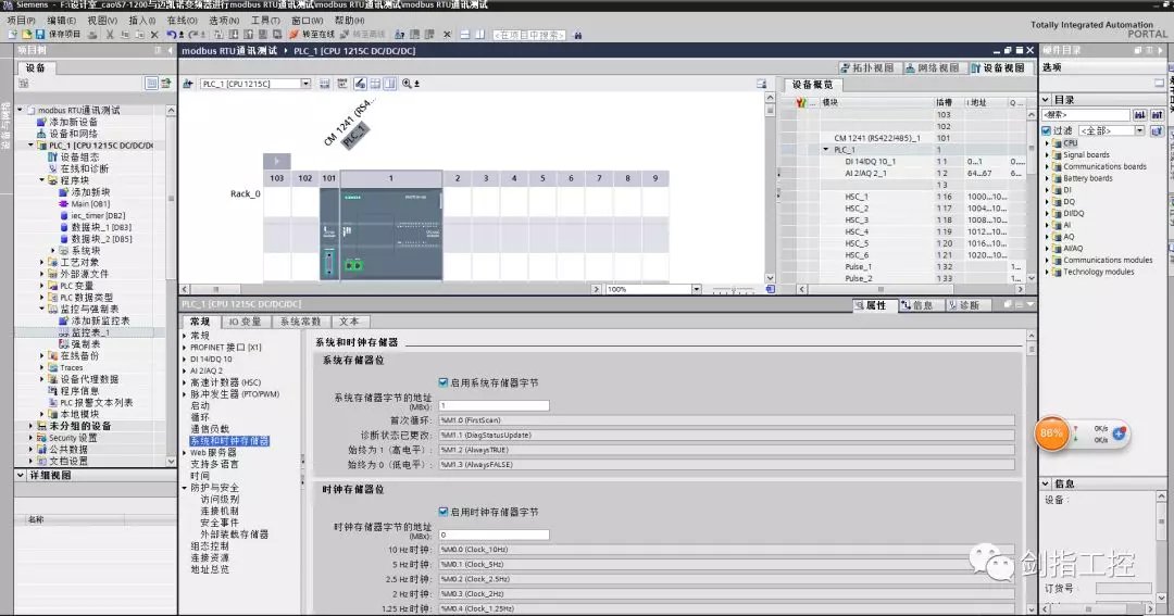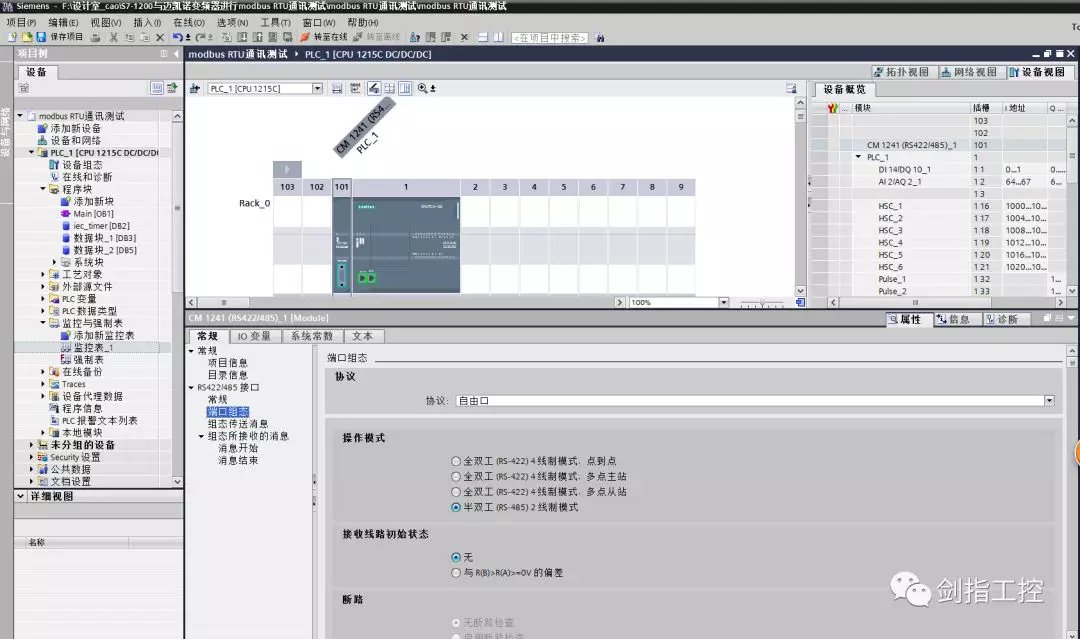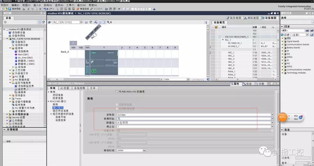 打开博图V15软件,新建项目,进行PLC的硬件组态,在CPU的左侧添加CM1241 modbusRTU通讯模块。