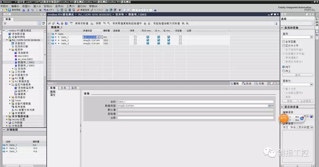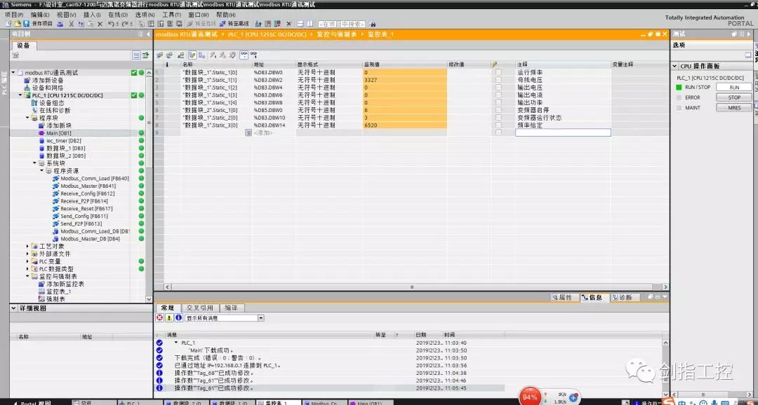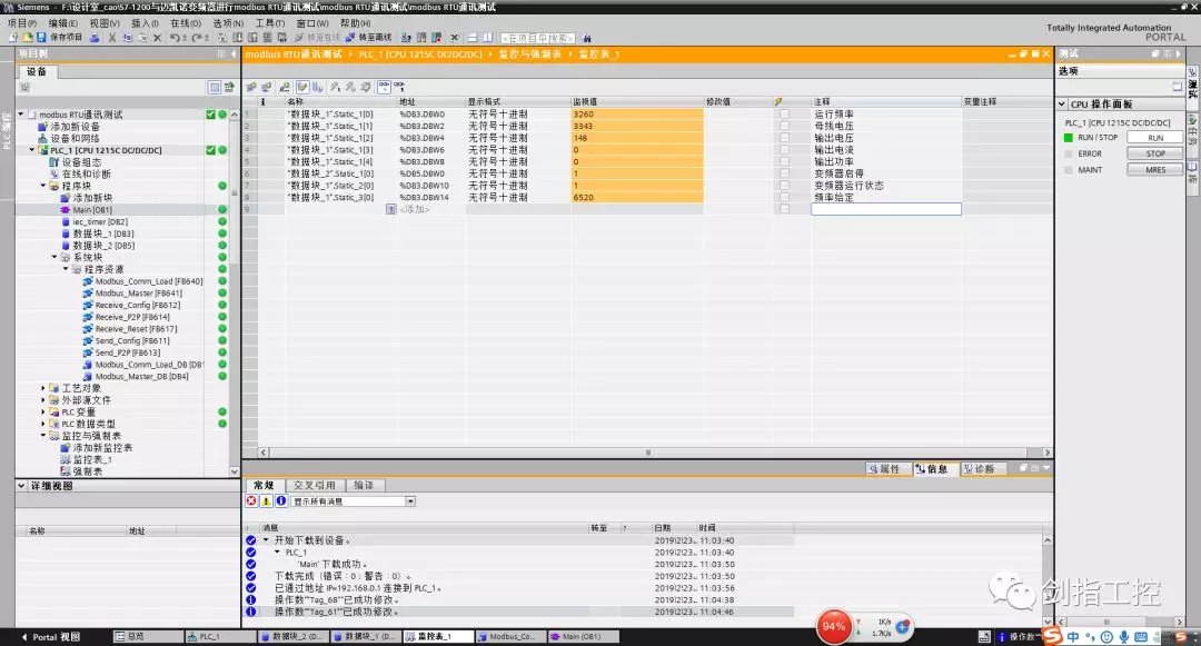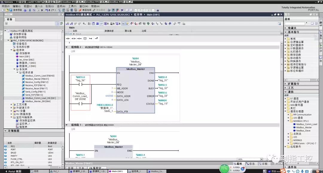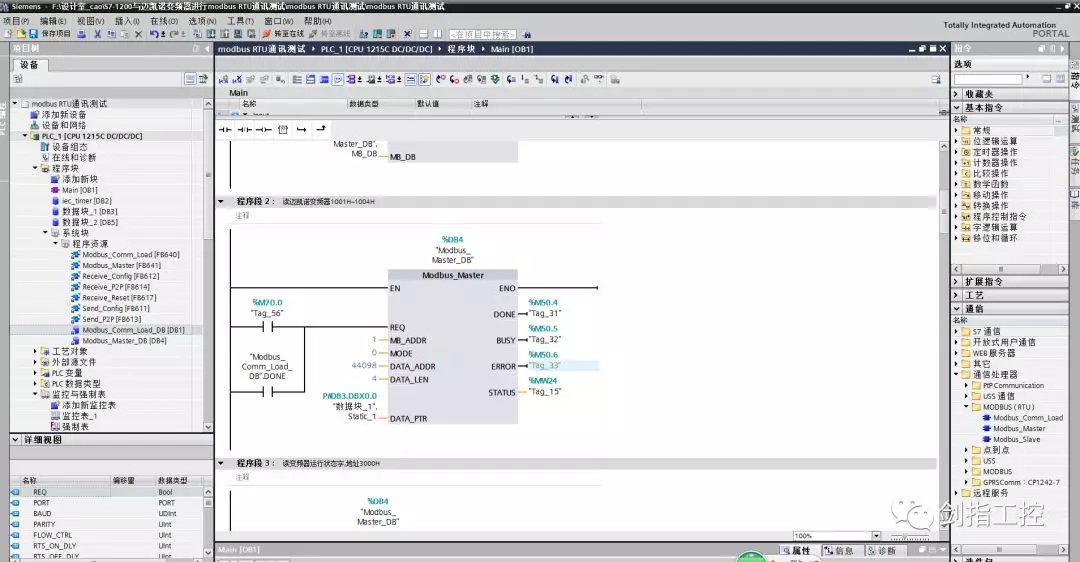 所以此程序就是用4号功能码读取从站地址为1的从4098(从站从4097)开始的4个数据(运行频率、母线电压、输出电压、输出电流),存放到数据块_1(DB3)的第一个变量的数组里(对应关系是一一对应的,即DB3.DBW0是运行频率,DB3.DBW2是母线电压,DB3.DBW4是输出电压,DB3.DBW6是输出电流),也就是说在上位机或监控里监控时,只要写DB3.DBW0、DB3.DBW2、DB3.DBW4、DB3.DBW6即可;