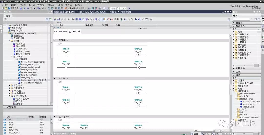 六、编写主站程序(读指令) 在OB1里,编写modbusRTU主站程序,点击右侧“通信”--“通信处理器”--“MODBUS(RTU)”--“Modbus_Master”,拖拽到程序段2中,自动生成背景数据块; Modbus_Master模块的引脚说明: EN--使能端,一直使能; REQ--上升沿触发; MB_ADDR--从站地址; MODE--读或写指令(0是读指令,1是写指令); DATA_ADDR--从站的起始地址(需将从站的地址由16进制转换为10进制,转换成10进制后,数据加1(因为从站地址是从0开始的,而PLC的地址是从1开始的,所以要加1)); DATA_LAN--指定读取的数据长度(即一下读取几个数据); DATA_PTR--指定读取的数据存放到此数组中; 输出引脚指定地址即可,如图9