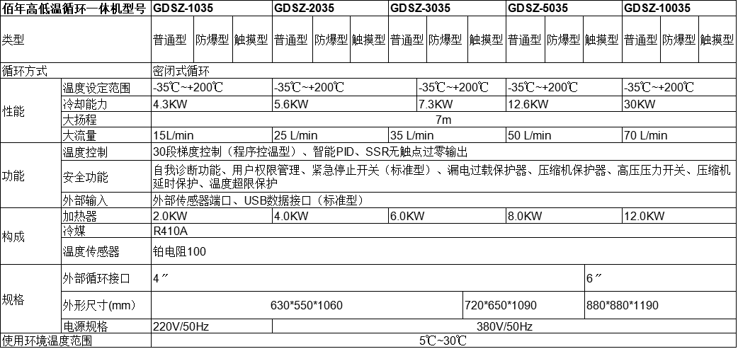 高低温循环一体机又叫高低温循环泵加热制冷一体机,是专门给反应釜做升降温用的设备,佰年生产的高低温循环一体机主要规格有GDSZ-10L、20L、30L、50L、100L、150L、200L、300L、400L、500L、1000L等规格,可实现低温 温度有:-20、-30、-40、-60、-80、-120等规格,高温至200°C。