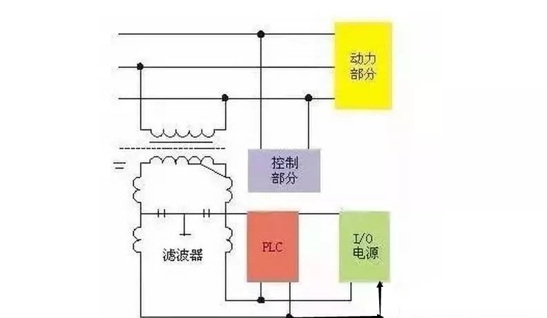 三、主要抗干扰措施 (1)电源的合理处理,抑制电网引入的干扰 对于电源引入的电网干扰可以安装一台带屏蔽层的变比为1:1的隔离变压器,以减少设备与地之间的干扰,还可以在电源输入端串接LC滤波电路。如图1所示 (2)安装与布线 ● 动力线、控制线以及PLC的电源线和I/O线应分别配线,隔离变压器与PLC和I/O之间应采用双胶线连接。将PLC的IO线和大功率线分开走线,如必须在同一线槽内,分开捆扎交流线、直流线,若条件允许,分槽走线最好,这不仅能使其有尽可能大的空间距离,并能将干扰降到最低限度。 ● PLC应远离强干扰源如电焊机、大功率硅整流装置和大型动力设备,不能与高压电器安装在同一个开关柜内。在柜内PLC应远离动力线(二者之间距离应大于200mm)。与PLC装在同一个柜子内的电感性负载,如功率较大的继电器、接触器的线圈,应并联RC消弧电路。 ● PLC的输入与输出最好分开走线,开关量与模拟量也要分开敷设。模拟量信号的传送应采用屏蔽线,屏蔽层应一端或两端接地,接地电阻应小于屏蔽层电阻的1/10。 ● 交流输出线和直流输出线不要用同一根电缆,输出线应尽量远离高压线和动力线,避免并行。