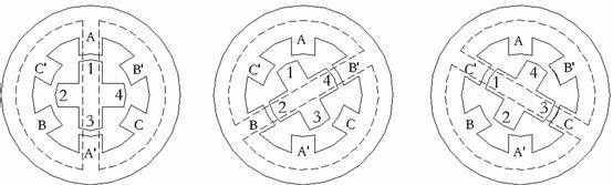 2、旋转: 如A相通电,B,C相不通电时,由于磁场作用,齿1与A对齐,(转子不受任何力以下均同)。 如B相通电,A,C相不通电时,齿2应与B对齐,此时转子向右移过1/3て,此时齿3与C偏移为1/3て,齿4与A偏移(て-1/3て)=2/3て。如C相通电,A,B相不通电,齿3应与C对齐,此时转子又向右移过1/3て,此时齿4与A偏移为1/3て对齐。 如A相通电,B,C相不通电,齿4与A对齐,转子又向右移过1/3て 这样经过A、B、C、A分别通电状态,齿4(即齿1前一齿)移到A相,电机转子向右转过一个齿距,如果不断地按A,B,C,A……通电,电机就每步(每脉冲)1/3て,向右旋转。如按A,C,B,A……通电,电机就反转。