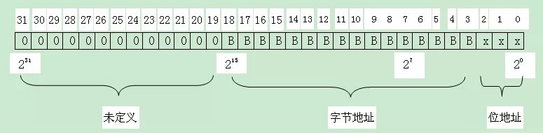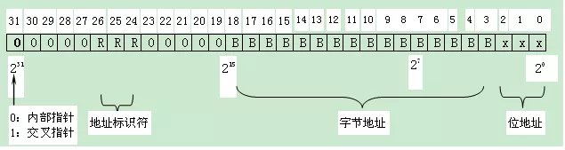 指针格式与存储器间接寻址的 32 位指针相同,第 0 位~ 第 2 位作为寻址操作的位地址,第 3 位~第 18 位作为寻址操作的字节地址,第 19 位 ~第 31 位没有定义,32 位指针的格式如下: 图4 内部区域32位指针
