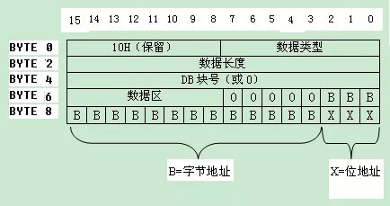 ANY指针 POINTER 是一种用于传递指针的形参数据类型,可视为 POINTER 类型的扩展,较 POINTER 类型为 复杂,长度为 10 个字节,增加的 2 字节,最高字节 (Byte 0) 固定为 B#16#10,第二字节 (Byte 1) 为 ANY 指针所指向区域的数据类型,而接下来的 2 字节 (BYTE 3, 4) 组合为一个 INT,为 ANY 指针所指 定区域的长度,称为重复系数 Repetition factor) 。其余 6 字节作用与 POINTER 类型相同。格式如下: 图7 ANY指针 |