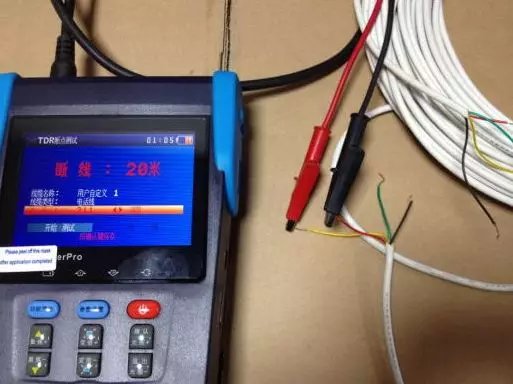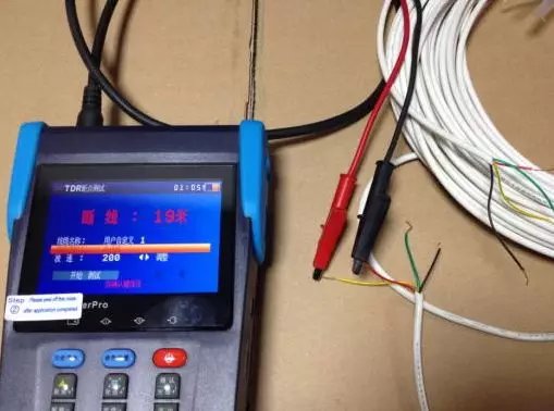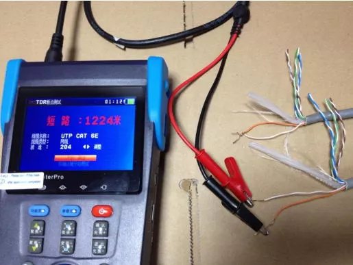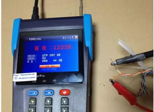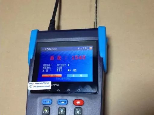3.点击设备的“确定”键进入测试: 4.测试短路的时候直接把另外一端的两根铜丝绞在一起,就可以测试短路的距离。经试验验证短路的测试距离相当准确,同我们所准备的测试线缆的距离吻合。