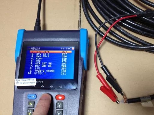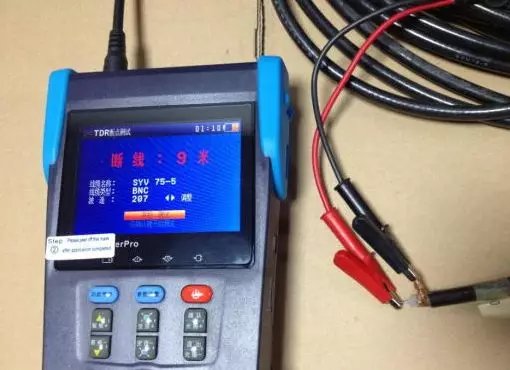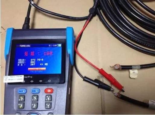 2.按设备第一行按键的”参数设置”键进入线型选择,按上下键选择对应的线型(如:75-2,75- 3,75-5)等同轴线缆的线型,使用设备配备的 TDR 鳄鱼夹连接线(仅限带 TDR 测量的产品)一端夹住同轴线的铜芯,另外一端夹住同轴线的屏蔽层铜丝. 3.点击设备的“确定”键进入测试: 4.测试短路的时候直接把另外一端的铜芯和屏蔽层的铜丝绞在一起,就可以测试短路的距离。经试验验证短路的测试距离相当准确,同我们所准备的测试线缆的距离吻合。