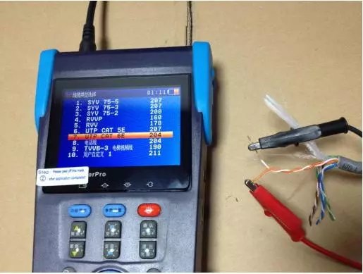 二、测试双绞线的操作:1.使用TDR测试功能测试同轴线缆时,首先进入TDR 断点和短路测试功能。 2.按设备第一行按键的”参数设置”键进入线型选择,按上下键选择对应的线型( 如:UTP CAT 5E,UTP CAT 6E)等双绞线缆的线型,使用设备配备的 TDR 鳄鱼夹连接线 (仅限带 TDR 测量的产品)一端夹住双绞线的一端,另外一端夹住双绞线的另外一端.(注意:所夹线缆应该为成对的双绞线,如“白橙/橙”等任意一对双绞线都可以。要不然会导致测试不出来或者测试不准确的后果。)
