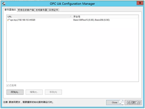 第一,打开Kepware的OPC UA配置,如下图,查看当前: URL,此步也可以自己添加一个URL日志,选择不同的安全策略。