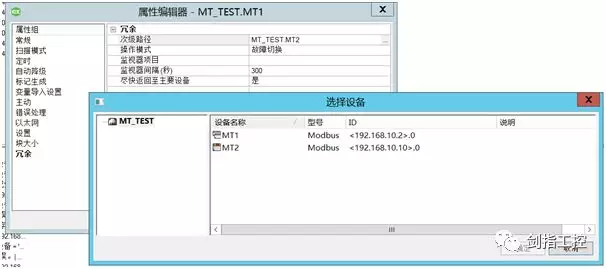 第九,选择MT1,右键选择属性,在“冗余”选项栏中,“次级路径”中点击右侧,在弹出的对方框中选择MT2,作为MT1的冗余设备。然后在“操作模式”中选择“故障切换”,即当MT1/MT2任一发生故障时,切换到另一台设备上。