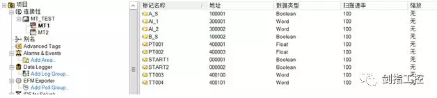 第八,按照下位机的配置添加TAG点,如下例子。然后选择设备MT1,进行复制,并黏贴在MT_TEST通道下,修改名称为MT2,修改IP地址为:192.168.10.10,完成冗余驱动的建立。