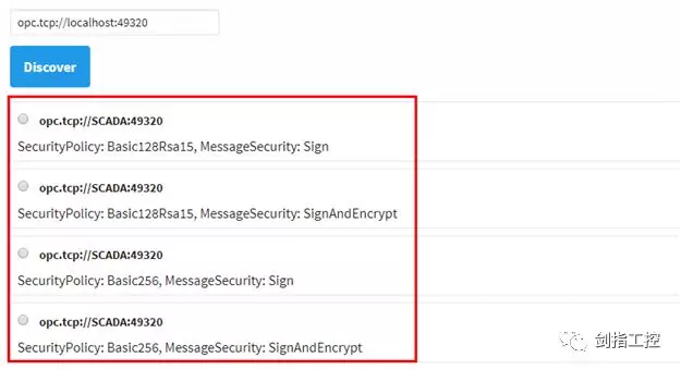 第二,在SCADA软件中打开OPC UA配置画面,输入上一步中的URL地址,点击”Discover”,会发现如下所示不同的安全策略的URL地址,根据需求选择其中之一。