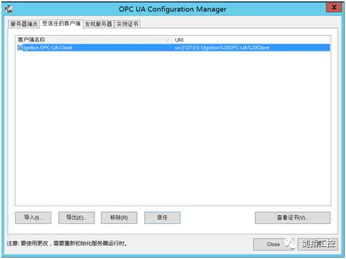 第三,完成OPC UA配置后,发现SCADA软件和KEPWARE软件的连接状态为“Faulted”,这是因为目前KEPWARE软件将SCADA的OPC Client设置为未授信设备,需要在KEPWARE的OPC UA 配置画面,“受信任的客户端”选项卡中选择此客户端(客户端名称前有红叉),然后点击“信任”,此时回到SCADA软件中查看与KEPWARE服务器端的连接状态为“Connected”。