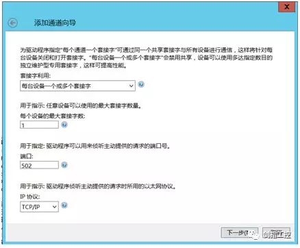 第三,指定端口号:502,IP协议:TCP/IP,端口号根据现场要求定义,一般默认502。一直下一步直到完成通道的配置。