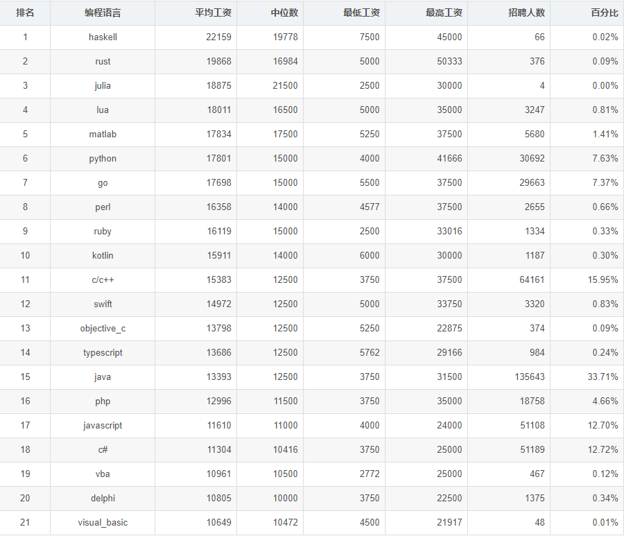 2019年9月哈尔滨招收程序员801人。2019年9月哈尔滨程序员平均工资6673元,工资中位数6500元,其中95%的人的工资介于3004元到12500元。编程语言和工资