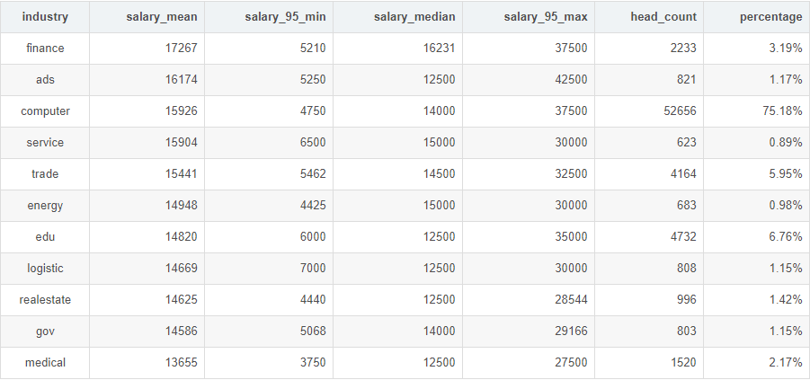 2019年9月杭州招收程序员13890人。2019年9月杭州程序员平均工资14980元,工资中位数12500元,其中95%的人的工资介于3750元到35000元。