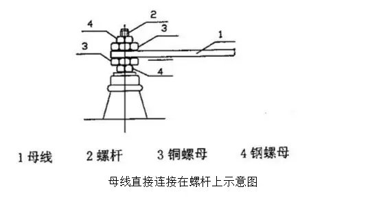 2 、当元件接头是螺杆时,母线可直接连接在螺杆上,如下图,为防止松动,需加锁母,在锁母之间不得加垫圈。