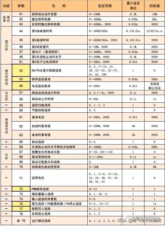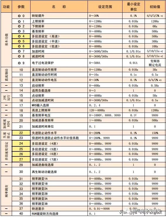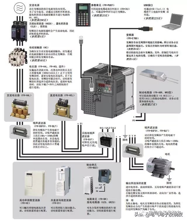 变频器顾名思义就是改变频率的变频器(VFD)是应用变频技术与微电子技术,通过改变电机工作电源频率方式来控制交流电动机的电力控制设备。 变频器主要由整流(交流变直流)、滤波、逆变(直流变交流)、制动单元、驱动单元、检测单元微处理单元等组成。变频器靠内部IGBT的开断来调整输出电源的电压和频率,根据电机的实际需要来提供其所需要的电源电压,进而达到节能、调速的目的,另外,变频器还有很多的保护功能,如过流、过压、过载保护等等。随着工业自动化程度的不断提高,变频器也得到了非常广泛的应用。 一、变频器的分类 1.按输入电压等级分类 在非标自动化中常用的是单相220 V变频器、三相220 V变频器。三相380V变频器. 2.按变换频率的方法分类 变频器按频率变换的方法分为交-交型变频器和交-直交型变频器。交-交型变频器可将工频交流电直接转换成频率、电压均可以控制的交流,故称直接式变频器。交直-交型变频器则是先把工频交流电通过整流装置转变成直流电,然后再把直流电变换成频率、电压均可以调节的交流电,故又称为间接型变频器。 3.按直流电源的性质分类 在交-直-交型变频器中,按主电路电源变换成直流电源的过程中,直流电源的性质分为电压型变频器和电流型变频器 二、变频器的给定控制方式 变频器常见的频率给定方式主要有:操作器键盘给定、接点信号给定、模拟信号给定、脉冲信号给定和通讯方式给定等。这些频率给定方式各有优缺点,必须按照实际的需要进行选择设置,同时也可以根据功能需要选择不同频率给定方式进行叠加和切换。 三、变频器的控制方式 (1) 矢量控制 矢量控制是通过矢量坐标电路控制电动机定子电流的大小和相位,以达到对电动机在d、q、0坐标轴系中的励磁电流和转矩电流分别进行控制,进而达到控制电动机转矩的目的。通过控制各矢量的作用顺序和时间以及零矢量的作用时间,又可以形成各种PWM波,达到各种不同的控制目的。目前在变频器中实际应用的矢量控制方式主要有基于转差频率控制的矢量控制方式和无速度传感器的矢量控制方式两种 (2) V/f控制 V/f控制是为了得到理想的转矩-速度特性,基于在改变电源频率进行调速的同时,又要保证电动机的磁通不变的思想而提出的,通用型变频器基本上都采用这种控制方式。V/f控制变频器结构非常简单,但是这种变频器采用开环控制方式,不能达到较高的控制性能,而且,在低频时,必须进行转矩补偿,以改变低频转矩特性。 (3) 转差频率控制 转差频率控制是一种直接控制转矩的控制方式,它是在V/f控制的基础上,按照知道异 步电动机的实际转速对应的电源频率,并根据希望得到的转矩来调节变频器的输出频率,就可以使电动机具有对应的输出转矩。这种控制方式,在控制系统中需要安装速度传感器,有时还加有电流反馈,对频率和电流进行控制,因此,这是一种闭环控制方式,可以使变频器具有良好的稳定性,并对急速的加减速和负载变动有良好的响应特性。 下面以三菱的变频器为例来讲解 1)变频的周边设备