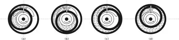 如图 1 ( a ) 所示,被测液体从进口端进入流量传感器内腔,在进、出口端形成压差,迫使活塞按图中箭头所示的方向旋转。随着液体的继续流入,活塞转到如图 1 ( b ) 所示位置,形成封闭的新月形截面的容腔 V1。在差压的作用下,活塞继续旋转,之前才形成的封闭的新月形截面 V1 与出口端连通而开始排液,如图 1 ( c ) 所示位置。当活塞旋转到如图 1 ( d )所示的位置时,又形成另一封闭的新月形截面容腔 V2,再继续旋转,则容腔 V2 与出口端连通而开始排液,然后转子又回复到如图 1 ( a ) 所示的位置。这样,活塞每旋转一周,从进、出口端流过的液体等于容积 V1 和 V2 的总和。