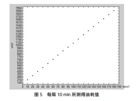 由图 5 可知,怠速情况下,发动机油耗以平均 9.965 mL/min的数值平稳递增,200 min 内共消耗了 1 993 mL 柴油,平均每小时所耗油量约 598 mL,这与发动机厂家提供的怠速油耗数值基本符合,误差为 13.04%。由于柴油机是怠速运行,单位时间内流过传感器的液体流速较低,与传感器的指定液体流速最小量程 1L/h 相差较大,因此发动机带载工作时,传感器所测得的油耗与实际发动机油耗的误差范围会有所降低,油耗传感器的测量精度也会随着发动机功率的增大而提高。