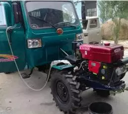 实验平台采用的是广西某企业生产的方拖 ( 如图 3 所示 ),其发动机为“时风欧”第二代的单缸发动机,功率为 14.7 kW,怠速空载运行情况下每小时消耗柴油约 0.52L,方拖空载载行驶一百公里所用柴油为 9~11L。按图 4 所示安装流量计传感器,因为该款发动机的回油管并不回到油箱而是直接回到滤清器上,所以无需装回油传感器。进油传感器把流过的柴油体积转换成脉冲信号发送给显示屏进行处理,发动机消耗的油量数值会实时显示在显示屏上。