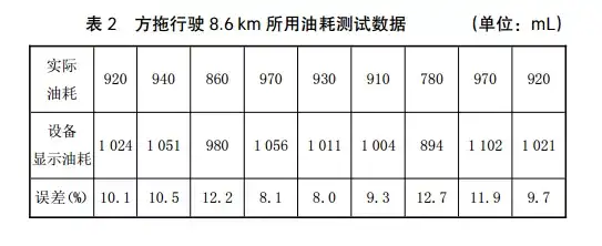 由表 2 可知,方拖共行驶 77.4 km,实际所用总油量为 8.2L,折算为百公里油耗约 10.59L,符合厂家提供的方拖百公里油耗数值,而油耗设备上显示方拖行驶 77.4 km 所用总油量为9.134L,与实际方拖所用油量相差 0.934L,误差为 10.22%,低于传统的油耗测量方法所算得的误差值。