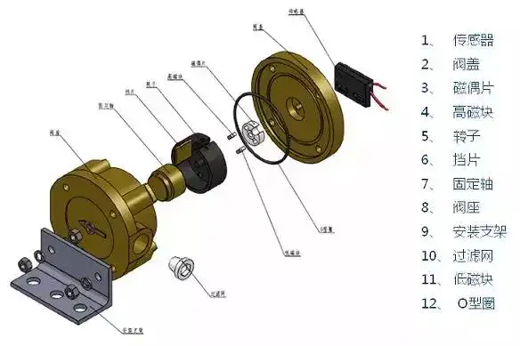 容积式流量计又称为定排量流量计 ( positive displacement flowmeter )。它主要由计量本体和测量部分组成,计量本体由壳体、活动体 (转子流量计的转子 ) 组成。其中,核心部件是活动体,它是测量过程中的运动部件。活动体和壳体构成的每个测量腔就是一个标准容积单元,用来测量被测流体的体积,测量部分实际上是一个转速或计数传感器,螺杆流量计上的其中一只螺杆伸出的小齿轮上嵌有磁材料,螺杆转动时传感器可以通过磁效应识别螺杆的转速,并转化为标准脉冲信号或电流信号,方便测量人员使用二次仪表显示油耗数值或被计算机采集信号并进行进一步的分析和应用。