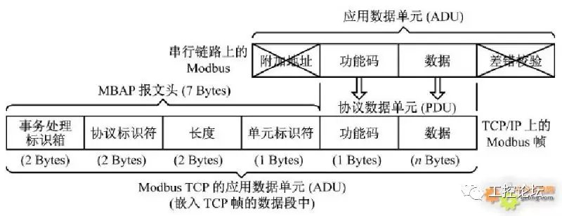 TCP-Modbus是运行在TCP/IP上的Modbus 报文传输协议。通过此协议,控制器相互之间通过网络(例如以太网)和其它设备之间可以通信。和Modbus的关系如下图。  熟不熟悉?惊不惊喜?前面出现过类似的图了。