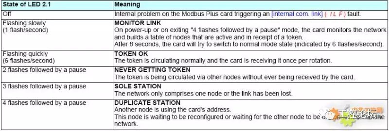 Modbus Plus的故障排查也非常简单,通过一个LED的闪烁频率就可以判断主要的故障:没有接线,闪3次停一下,每秒六次快闪就是正常工作,其余见下图:
