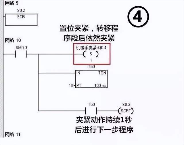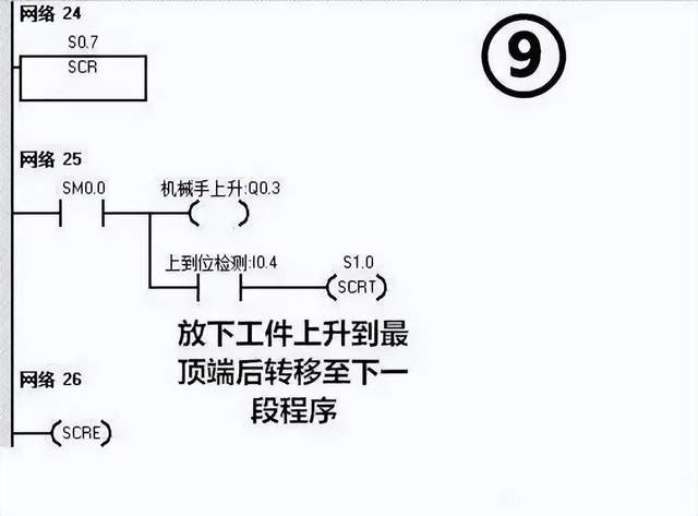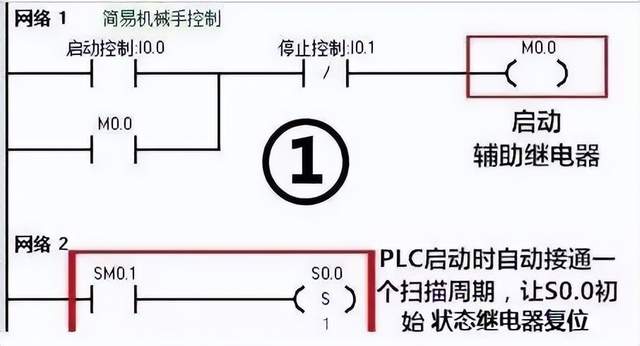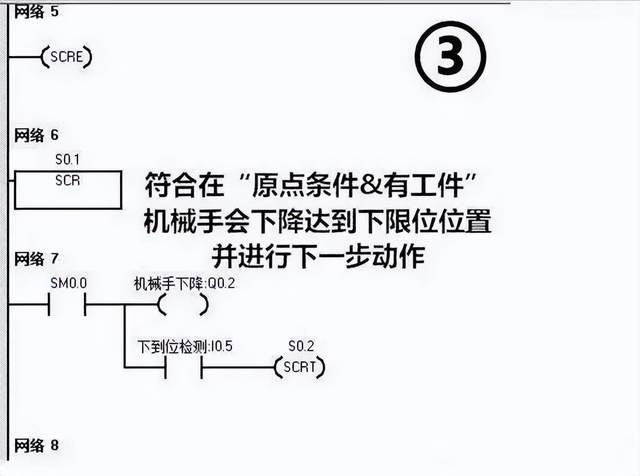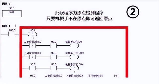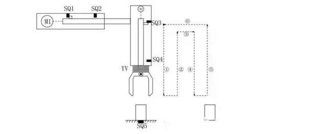 今天咱们来谈一谈如何利用PLC来实现简单的搬运动作。这个例子完美地用到了顺序控制的指令,实际应用起来真的是非常方便,程序循环控制起来也是得心应手! 废话不多说,进入我们今天的主题! 简易机械手结构图如图所示: M1为控制机械手左右移动的电动机 M2为控制机械手上下升降的电动机 YV线圈用来控制机械手夹紧防松 SQ1为左到位检测开关 SQ2为右到位检测开关 SQ3为上到位检测开关 SQ4为下到位检测开关 SQ5为工件检测开关 简易机械手的控制要求如下: 机械手要将工件从工位A移到工位B 处; 机械手的初始状态(原点条件)是机械手应停在工位A的上方,SQ1、SQ3均闭合; 若原点条件满足且SQ5闭合(工件A处有工件),按下启动按钮,机械手按“原点→下降→夹紧→上升→右移→下降→放松→上升→左移→原点”的步骤工作。 动作图编程前理顺动作如何转移: 定义符号表: 满足所有动作的程序如下: 一大堆梯形图看着真是眼花缭乱,不用担心我们一段一段分析分析这个机械手是如何工作的! 其实这个图没有那么多的并行分支,所以转移起来逻辑非常简单! |
