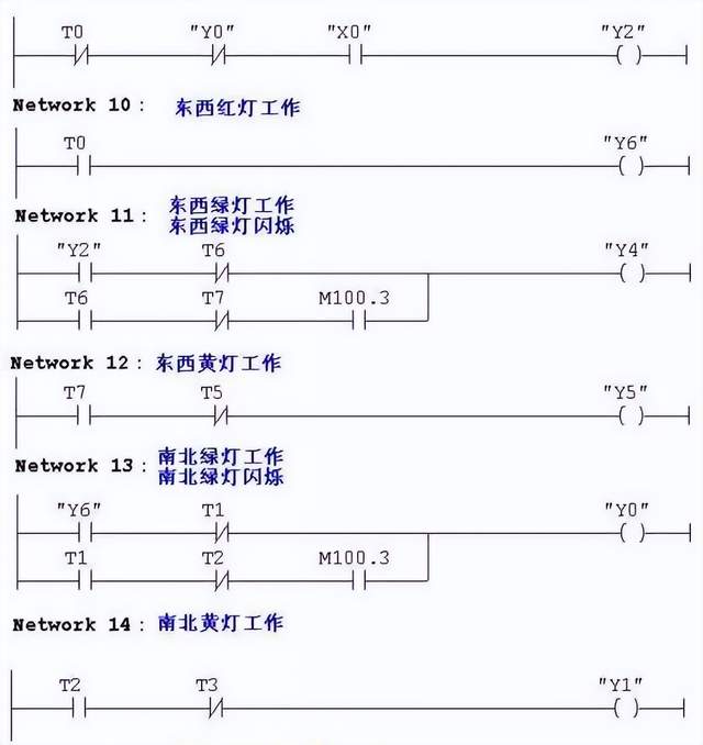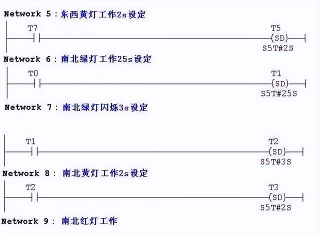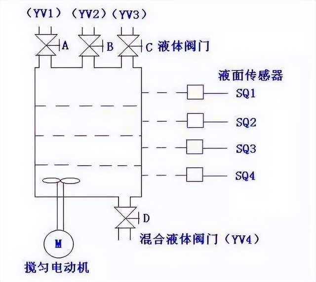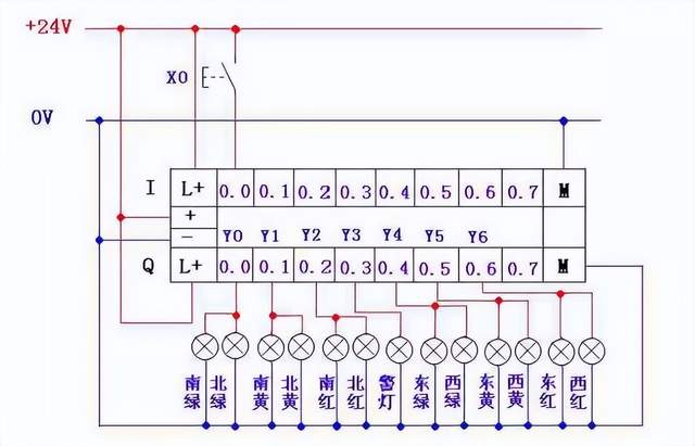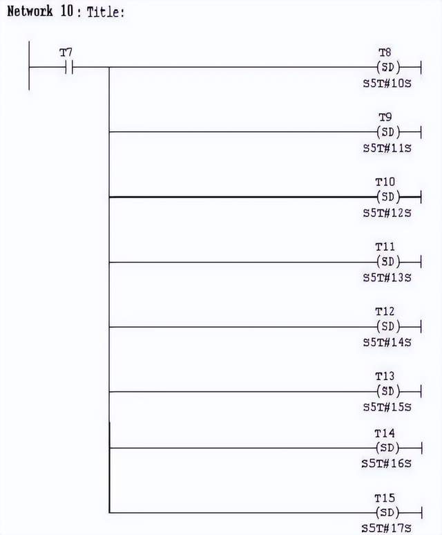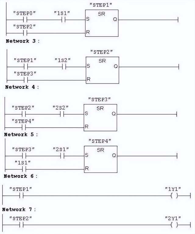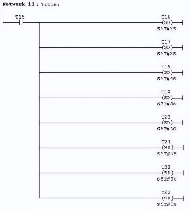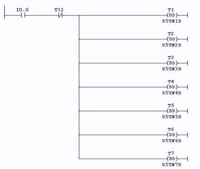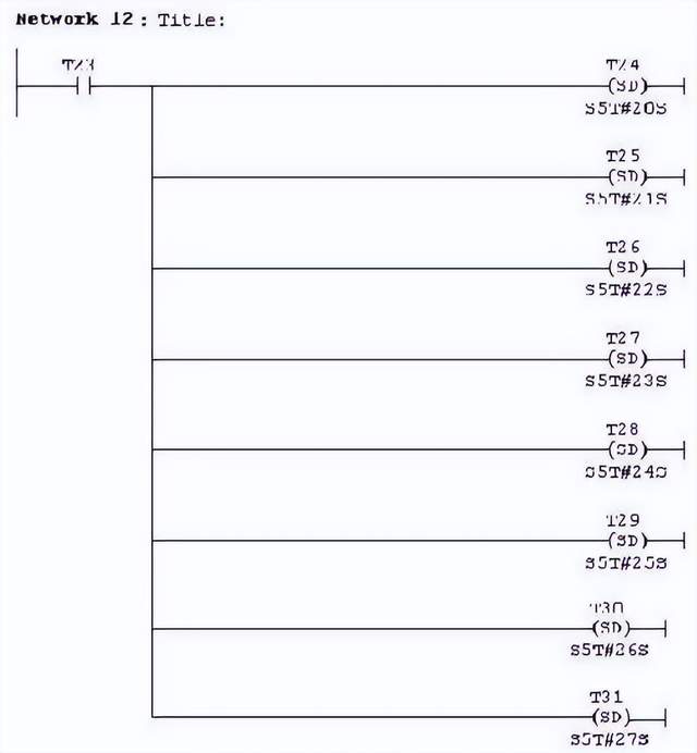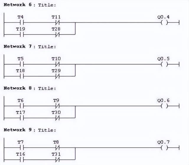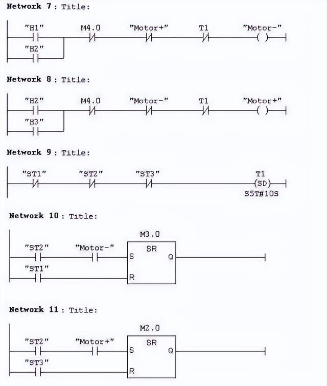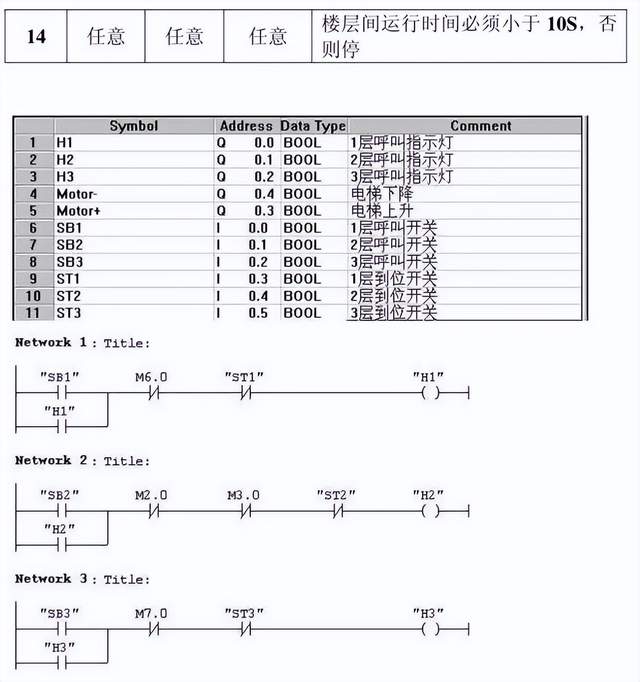 十字路口的交通指挥信号灯布置: 一、控制要求 1、信号灯系统由一个启动开关控制,当启动开关接通时,该信号灯系 统开始工作,当启动开关关断时,所有信号灯都熄灭。 2、南北绿灯和东西绿灯不能同时亮。如果同时亮应关闭信号灯系统, 并立刻报警。 3、南北红灯亮维持 25s。在南北红灯亮的同时东西绿灯也亮,并维持 20s。到 20s 时,东西绿灯闪亮,闪亮 3s 后熄灭,此时,东西黄 灯亮,并维持 2s。到 2s 时,东西黄灯熄灭,东西红灯亮。同时, 南北红灯熄灭,南北绿灯亮。 4、东西红灯亮维持 30s。南北绿灯亮维持 25s,然后闪亮 3s 后熄灭。同时南北黄灯亮,维持 2s 后熄灭,这时南北红灯亮,东西绿灯亮。 5、以上南北、东西信号灯周而复始地交替工作状态,指挥着十字路口 的交通,其时序如下所示。 二、PLC 接线 三、定义符号地址 四、梯形图程序 三层楼电梯控制 电梯的上升、下降由一台电动机控制;正转时电梯上升、反转时电梯下降。各层设一个呼叫开关(SB1、SB2、SB3)、 一个呼叫指示灯(H1、H2、H3)、一个到位行程开关(ST1、ST2、ST3)。 一、控制要求: (1)各层的呼叫开关为按钮式开关,SB1、SB2 及 SB3 均为瞬间接通有效 (即瞬间接通的即放开仍有效)。 (2)电梯箱体上升途中只响应上升呼叫,下降途中只响应下降呼叫,任何 反方向呼叫均无效,简称为不可逆响应。具体动作要求,如下表。 (3)各楼层间有效运行时间应小于 10S,否则认为有故障、自动令电动机停转。 多种液体自动混合装置的PLC控制 如图所示为三种液体混合装置,SQ1、SQ2、SQ3 和 SQ4 为液面传感器, 液面淹没时接通,液体A、B、C与混合液阀由电磁阀YV1、YV2、YV3、 YV4控制,M为搅匀电动机,其控制要求如下: 1.初始状态 装置投入运行时,液体A、B、C阀门关闭,混合液阀门打开 20s 将容 器放空后关闭。 2.起动操作 按下启动按钮 SB1,装置开始按下列给定规律运转: ①液体 A 阀门打开,液体 A 流入容器。当液面达到 SQ3 时,SQ3 按通, 关闭液体 A 阀门,打开液体 B 阀门。 ②当液面达到 SQ2 时,关闭液体 B 阀门,打开液体 C 阀门。 ③当液面达到 SQ1 时,关闭液体 C 阀门,搅匀电动机开始搅拌。 ④搅匀电动机工作 1min 后停止搅动,混合液体阀门打开,开始放出 混合液体。 ⑤当液面下降到 SQ4 时,SQ4 由接通变断开,再过 20s 后,容器放空, 混合液阀门关闭,开始下一周期。 3.停止操作 按下停止按钮 SB2 后,要将当前的混合操作处理完毕后,才停止操 作(停在初始状态) 参考程序: 霓虹灯广告屏控制器的设计 用 PLC 对霓虹灯广告屏实现控制,其具体要求如下: 该广告屏中间 8 个灯管亮灭的时序为第 1 根亮→第 2 根亮→第 3 根 亮→…→第 8 根亮,时间间隔为 1s,全亮后,显示 10s,再反过来从 8→7→…→1 顺序熄灭。全灭后,停亮 2s,再从第 8 根灯管开始亮 起,顺序点亮 7→6→…→1,时间间隔为 1s,显示 20s,再从→2→…→8 顺序熄灭。全熄灭后,停亮 2s,再从头开始运行,周而复始。感谢关注创控教育。 参考梯形图程序: 设计程序,使两个气缸顺序动作,其顺序为:A1B1B0A0。 (一)气控回路 (二)位移-步骤图