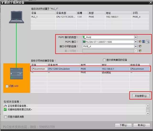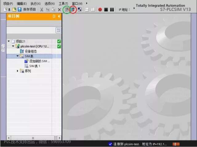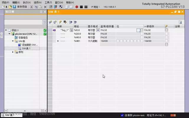 PLCSIM使用步骤 在博途软件中点击仿真按钮,可启动S7-1200仿真器。 这时,会弹出仿真器对话框的精简视图: 点击右下角按钮,可以切换到项目视图: 点击左上角的新建按钮,可以新建一个仿真项目。 然后回到博途编程界面,选中项目里的1200PLC,点击下载按钮,会弹出如下下载选项对话框,按照图中所示选择接口,并点击“开始搜索”按钮,,在兼容设备对话框里,会显示出仿真器设备: 选中该设备,点击下载,即可将项目下载到1200仿真器中。 下载项目成功后,可以点击仿真器上的启动和停止按钮,更改CPU的运行模式,如下图红色圈和绿色圈所示: 在PLCSIM左侧项目树中可以看到SIM表,用户可以添加自己的SIM表,然后在该表中添加变量,进行变量值的监控和修改。 下面通过一个例子来说明仿真器的SIM表如何使用。 在SIM表1中添加几个简单变量I0.0,Q0.0,M0.0和MB1进行测试: 此时点击“位”列的复选框,可以对I0.0进行值更改: 默认情况下,只有输入点是允许更改的,Q点或者M点的修改列为灰色,只能监视无法更改值。如果想更改非输入点的值,需要点击工具栏的“启动/禁用非输入修改”按钮,便可以启动非输入变量的修改功能。 启动该功能后,便可以对刚刚建立的Q点及M点变量进行赋值操作了: