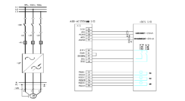 1、设计思路 选用一台具有正反转功能的变频器,功率为3KW,因为功率较小电磁干拢不大,可以不考虑输入电抗器,DCS控制需有变频器的状态信号(准备、运行、故障),以及实际电流信号,变频器的启停及正反转由DCS作控制,速度控制DCS采用4-20mA模拟信号作控制。 2、变频器控制回路设计图 3、变频器参数设定 其它参数可用变频器默认值,改善变频器及对电机的控制特性,如加、减速,U/F曲线等由调试中按实际运行调节设定。 4、实际安装及接线时应注意要点 实际安装中注意模拟量信号线的屏蔽,屏蔽接地在DCS侧,变频器侧悬空;模拟量信号变频器默认为0-20mA,所以必须要设定为4-20mA;因故障反馈信号是由输出继电器3得到,该信号设置1403为故障反信号,所以接线注意接常闭点,其它二个反馈信号接常开点;同时必需检查变频器的各个跳针与设定是否正确;其它按变频器前述安装要求进行。 |