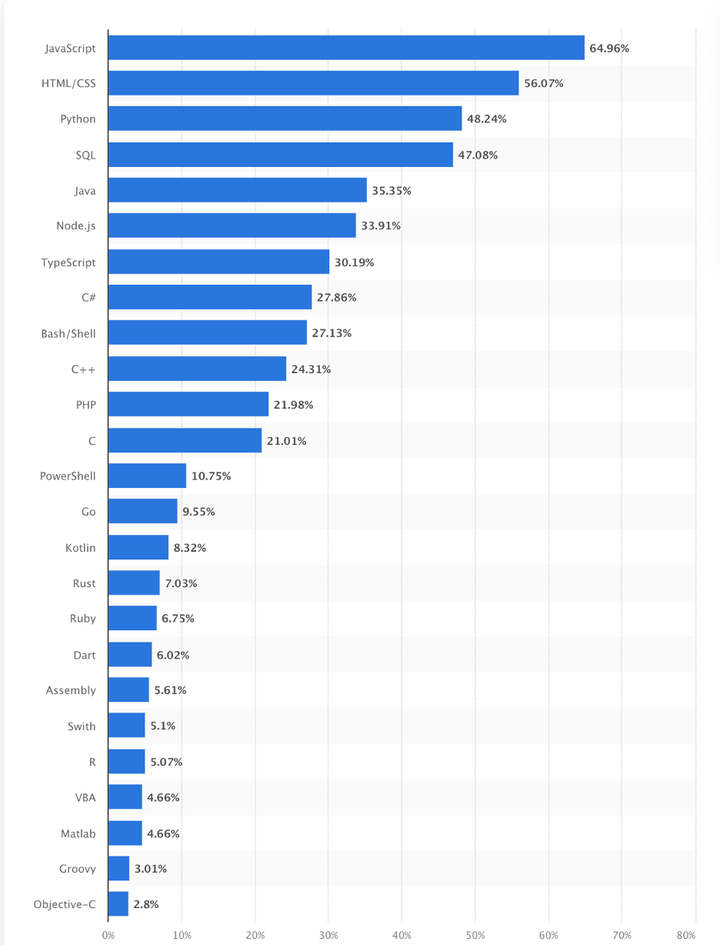 总结 综上所述,我们可以使用多种编程语言来开发人工智能。没有一种语言是十全十美的,有的专注于开发速度,有的具备概率模型的天然优势,而另外一些则能与现有软件无缝衔接。究竟使用哪种编程语言,最终还是要看我们的实际需求。文章最后为大家分享一份2021年常用编程语言极其占比信息。 2021年常用编程语言极其占比表![]() |