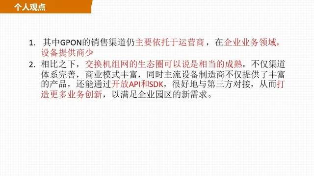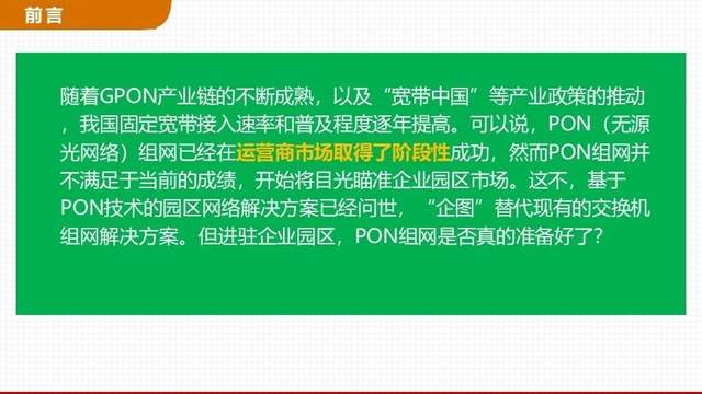 随着GPON产业链的不断成熟,以及“宽带中国”等产业政策的推动,我国固定宽带接入速率和普及程度逐年提高。 可以说,PON(无源光网络)组网已经在运营商市场取得了阶段性成功,然而PON组网并不满足于当前的成绩,开始将目光瞄准企业园区市场。这不,基于PON技术的园区网络解决方案已经问世,“企图”替代现有的交换机组网解决方案。但进驻企业园区,PON组网是否真的准备好了? |