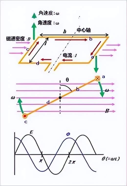发电原理详解 2 假设面积为S(=l×h)的线圈在均匀磁场中以ω的角速度旋转。 此时,假设线圈表面的平行方向(中间图中的黄线)和相对于磁通密度方向的垂直线(黑色虚线)形成角度为θ(=ωt),则穿透线圈的磁通量Φ由下式表示: 另外,通过电磁感应在线圈中产生的感应电动势E如下: 当线圈表面的平行方向垂直于磁通方向时,电动势变为零,而水平时电动势的绝对值最大。