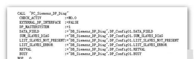 以下面的硬件配置为实例来介绍如何调用FC125【FC_Siemens_DP_Diag】来完成对Profibus总线的诊断。 三、FC125“FC_Siemens_DP_Diag”接口简介 接口参数说明 CHECK_ACTIVE : 为1时开始检测从站。 EXTERNAL_DP_INTERFACE : 选择DP 主站的接口,0 表示集成在CPU 上的DP 主站,1 表示外部DP 主站接口,如CP443-5 等。 DP_MASTERSYSTEM : PROFIBUS 的ID 号,在硬件组态中可以查看到PROFIBUS的ID 号。有几条PROFIBUS网络,就要调用FC125 几次,分别赋值它们的PROFIBUS ID 号,数据类型为INT。 DATA_FIELD : 50 个字节的数据区,仅供FC125 内部使用,数据类型为POINTER。 SUM_SLAVES_DIAG : 从站诊断的总数,数据类型为INT。 LIST_SLAVES_NOT_PRESENT: 检查到丢失的从站(软件已经组态但是现场没有连接硬件),16个字节的数据区,每一个数据位对应一个从站,置1 表示一个从站丢失,如果丢失的从站返 回或维修好,相对应的位复位。数据类型为POINTER。 LIST_SLAVES_ERROR : 故障的从站(部分模块有故障,其他模块可以连续运行),16 个字节的数据区,每一个数据位对应一个从站,置1 表示一个从站故障,如果故障的从站返回或 维修好,相对应的位复位。数据类型为POINTER。 RETVAL : 调用FC125 时的状态返回值,数据类型为INT。 BUSY : 为1表示当前正在执行。