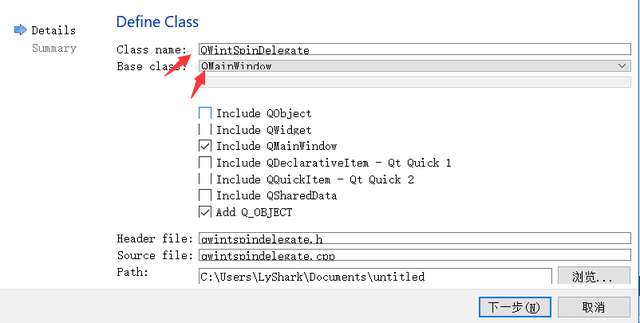 此处我们分别重写三个代理接口,其中两个ComBox组件用于选择婚否,SpinBox组件用于调节数值范围,先来定义三个重写部件。 先来实现一个代理,代理到Spin组件上,首先需要在项目上右键 - 选择addnew -> C++Class 输入自定义类名称QWintSpinDelegate,然后基类继承QStyledItemDelegate/QMainWindow,然后下一步结束向导。