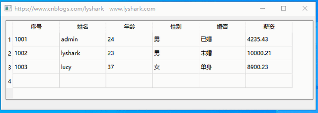 DataList[1] << "1002" << "lyshark" << "23" << "男" << "未婚" << "10000.21";