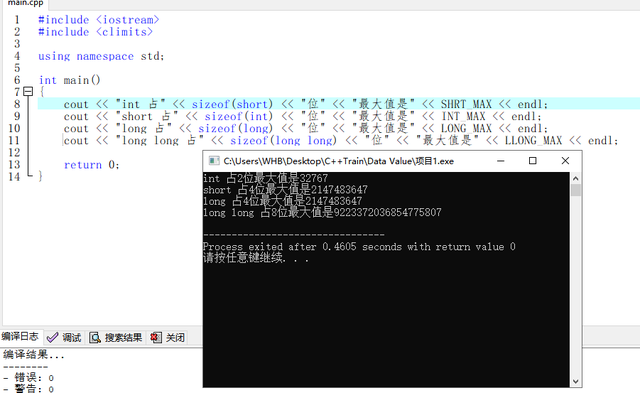 正文 面向对象编程OOP的本质是设计自己的数据类型,如果利用正确的数据结构,这对特定的项目解决起来事半功倍,在创建自己的数据结构之前,我们先了解C++内置的数据类型。内置的数据类型分为基本数据类型和复合类型。 1.整型变量程序都要存储信息--》比如班级同学的成绩,今天的天气,恒生电子股票的价格等。为把信息存储在计算机中,程序必须记录三个基本属性:信息存储在哪?具体的数值是多少?信息的类型是什么?面对这些问题,这里我们只需要声明定义一个变量就可以了: int moneyConut = 5;宁一般在家私房钱需要找个安静的地方存放,在C++中就利用变量存储宁想保存的数据。 回到顶部 1.1 变量名我们使用变量时,名字时需要考虑的重点,如果只是 int a,b,c;那么一个稍微大一点的程序,可阅读性就会很差。因为不知道这些变量存放的是什么数据。如果变量表示出差旅费,应将其命名为cost_of_trip或者costOfTrip。但是变量名也应该遵循C++的规则,就像宁给儿子取名一样。大致上有三点:名字只能由数字、字母、下划线组成,名字的第一个字符不能是数字,不能使用C++关键字作名字。 有时一个单词组成的名字往往不够表达意义,通常的做法是用下划线将单词分开,如my_money;或者从第二个单词开始将每个单词的第一个字母大写。比如myMoney。(C程序员喜欢使用下划线,而在JAVA里更倾向于大写的方式)。 随着对 C++的逐步了解,将发现很多有关前缀命名风格的示例,还有其他更奇异、更违反直觉的风格,采不采用这些风格,完全取决于程序员。在C++所有主观的风格中,一致性和精确度是最重要的。根据自己的需要、喜好和个人风格来使用变量名(或必要时,根据雇主的需要、喜好和个人风格来选择变量名)。 回到顶部 1.2 整型数据存储整数和浮点数是最常见的数据,也是理解起来最简单的。整型数据就是没有小数的数据,就像1,-99,0一样。在数学上,整数没有界限,是负无穷到正无穷的开区间,但是计算机内存是有限的,因此,C++语言只能提供一个整数的部分子集。 C++基本类型有char、short、int、long和C++新增的long long。这些数据类型还分有符号和无符号,无符号不能表示负值,(因为最高位不是符号位)在定义变量时数据类型前加上 unsigned就可以表示无符号型数据。比如--》unsigned int a = 99;C++整型分为short、int、long、和long long。这些类型通过使用不同数目的位来存储值,最多能够表示四种不同的整数宽度。如果在所有的系统中,每种类型的宽度都相同,那么使用起来将非常方便。但是现实没那么简单,没有一种选择能满足所有的计算机设计要求。 下面说说位和字节:计算机内存由一些叫做位(bit)的基本单元组成。可以将位看成电子开关,通路就是1,短路就是0。这就是我们说的二进制,假设我们有8位,那么可以演变出2^8也就是256种不同的数字,(每一位都有两种选择),而16位单元可以表示2^16个数字。字节(byte)通常指的是8位的内存单元,字节是描述计算机内存量的度量单位,1KB等于1024个字节,1MB等于1024KB。 整型数据的大小和操作系统有关,在老式的IBM PC机上,int占16位(2个字节),而在Windows XP,Windows 7和其他很多微型计算机中,int 占4个字节。一般声明的变量都是有符号整型,这意味着在每种类型的取值中,负值和正值几乎相同,比如16位的int取值范围是-32768到+32767。(上面解释了16位可以表示65536个值)。下面通过两个方法判断系统整型所占的位数:1--》利用运算符sizeof(),它将返回小括号内的数据长度,单位是字节。2--》利用climits头文件,其中包含了各种限制的宏定义。利用这些名称,可以了解整型最大取值。下面看程序:==> 点击查看代码 如此我们便得到了自己操作系统的整型数据大小: 个人感觉sizeof好用一点,下面是一些climits头文件中的符号常量: 点击查看 回到顶部 1.3 整型数据初始化要使用变量,首先要创造变量,对变量初始化。初始化就是将声明定义合并在一起:int myMoney = 0;或者将变量给另一个变量初始化:int yourMoney = myMoney;C++不常见的几种初始化:int h(1)、int h{1}(C++11特性,需要注意精度丢失,被称为初始化器列表)、int h = {1}。 将大括号初始化器用于单值变量的情形还不多,C++11标准使得这种情形更多了,使用花括号初始化器时,括号内可以不包含任何东西,此时变量值为0。最好在声明时就给变量赋值,将变量声明赋值分开,可能带来一些意想不到的麻烦:前面我们声明int a;后文:int b = a;此时a的值是不确定的。(如果是全局变量或者静态变量,值为0;但如果是局部变量,它的值是未知的,这取决于它被创建之前相应内存单元保存的值。这涉及到虚拟内存图,我们后面再谈。) 回到顶部 1.4 无符号类型前面介绍的都是有符号整型,也就是最高位为符号位。下面介绍无符号类型,其优点是可以增加变量能够存储的最大值,理解起来也很简单,最高位不代表符号位,它的最大值就比有符号多一倍,例如,short表示的范围是-32768到+32767,那么无符号版本的范围就是0到65535。前面说了使用关键字unsigned修饰无符号类型,这里需要注意--》unsigned x = 9;这个也是对的,因为unsigned 本身是unsigned int的缩写。下面来看一个有关无符号和有符号整型的经典案例:==》 点击查看代码 我们可以猜猜打印的结果是什么,答案如下:--》 首先shortMax是short的最大值,把它转换成无符号给ushortMax赋值,所以打印出来32767。但是我们强行让shortMax加一,这