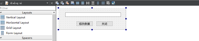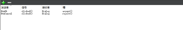 直接选中Dianlog.ui并绘制界面为以下,一个编辑框,两个按钮。 其次需要在Dialog对话框上增加两个信号,分别是点击和关闭,并将信号关联到两个槽函数上,其信号应该写成如下样子。 接着我们点开dialog.cpp这个类则是对话框类,类内需要定义两个成员函数,它们的功能如下: - 第一个 GetValue() 用来获取当前编辑框内的数据并将数据返回给父窗体。