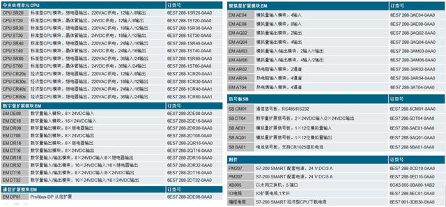 相关推荐 (1)西门子操作面板(HMI)订货号大全 (2)西门子S7-1200(全系列)订货号大全 (3)西门子S7-1500(标准型)订货号大全 (4)西门子ET200SP(标准型)订货号大全 硬件选型关注 硬件结构示意图 一、S7-200SMART 订货号说明二、S7-200SMART 订货号概览三、S7-200SMART CPU订货号(1)目前不支持固件版本≥V2.3,具体请参考S7-200 SMART 系统手册以了解您的特定 CPU 型号和版本。 四、S7-200SMART EM订货号五、S7-200SMART信号板订货号(2)电池板插入 S7-200 SMART CPU(固件版本 V2.0 及更高版本)的信号板插槽中,购买 SB BA01 电池板时不含电池(类型 CR1025)。必须单独购买电池。 六、S7-200SMART前连接器订货号七、S7-200SMART总线连接器、电缆及中继器订货号八、S7-200SMART I/O扩展电缆订货号九、SMART LINE 触摸屏订货号十、选型案例 |