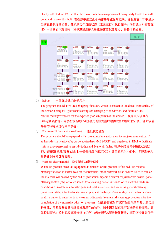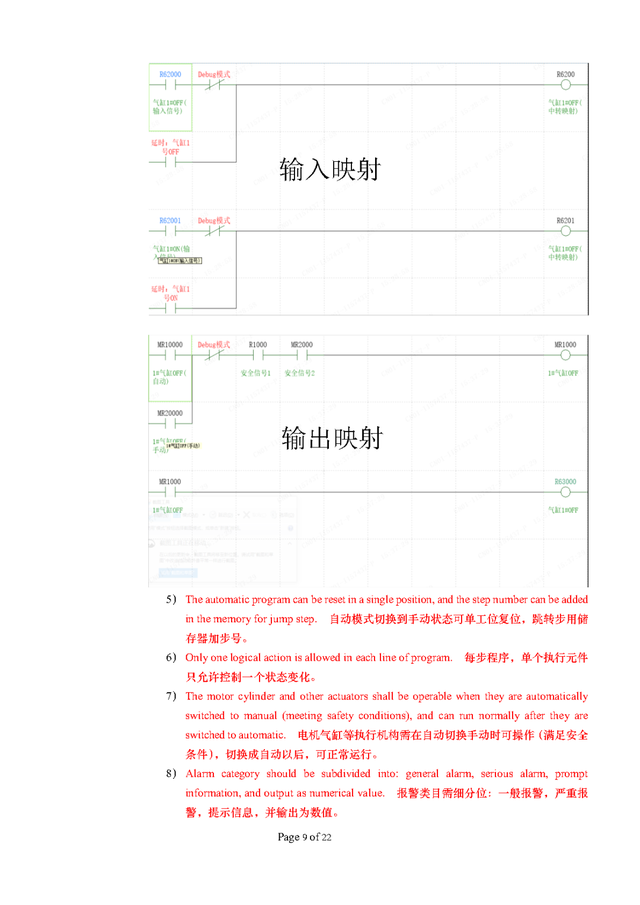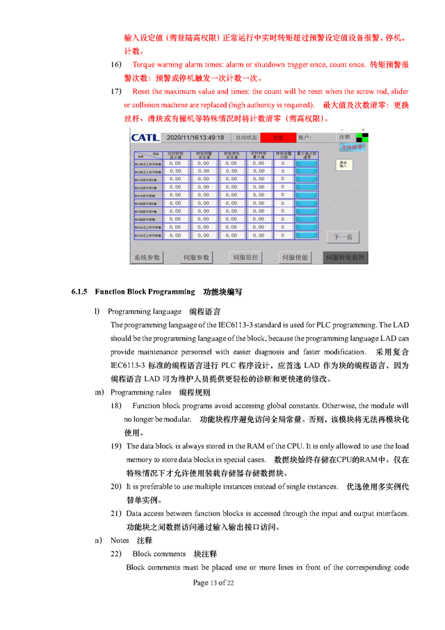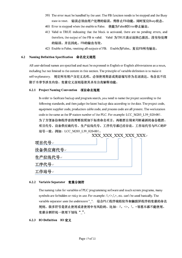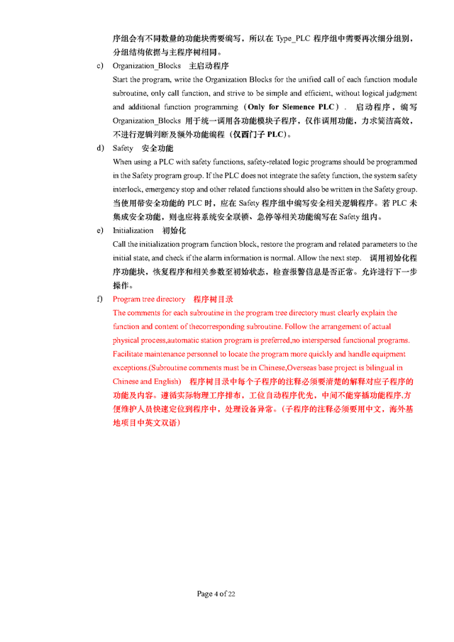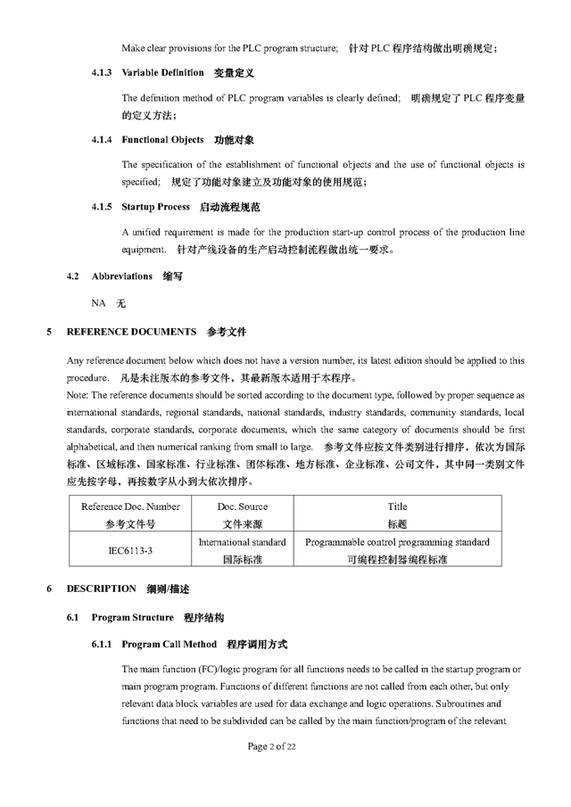 通常一套好的PLC程序需要具备以下几个特征:简单性、可读性、正确性、可靠性、易改性、扩展性、完整的报警系统和方便程序模拟。对于不同的行业和工艺,尽管这些特征表现形式多样,但其核心思想是一样的。今天我们就展开讲讲PLC编程规范! 1、简单性 使PLC程序尽可能简单。简单的含义就是尽可能的使用标准化的程序框架,尽可能使用简单的指令。 要想程序简单,从大的方面讲,要优化程序结构,用流程控制指令简化程序,从小的方面讲还要用功能强的指令取代功能单一的指令,以及注意指令的安排顺序等。 2、可读性 要求所设计的程序可读性要好。这不仅便于程序设计者加深对程序的理解,便于调试,而且,还要便于别人读懂你的程序,便于使用者维护。必要时,也可使程序推广。 要使程序可读性好,所设计的程序就要尽可能清晰。要注意层次,实现模块化,以至于用面向对象的方法进行设计。要多用一些标准的设计。 如遇特殊情况下采用语言编程,多数情况下请使用梯形图编程,方便阅读。 再就是I/O分配要有规律性,便于记忆与理解。必要时,还要做一些注释工作。内部器件的使用也要讲规律性,不要随便地拿来就用。 可读性在程序设计开始时就要注意。这不易完全做到。因为在程序调试的过程中,指令的增减,内部器件的使用变化,可能使原较清晰的程序,变的有些乱。所以在设计时就对调试增减留有一定的余地,然后调试完毕后再做一下整理,这样所设计的程序具有更高的质量。 程序的注释,起码应该有以下几个方面: A、系统注释:整套程序的版权公司和此套程序用途 B、程序块注释:此程序块的主要用途和作者 C、段注释:此段代码的用途 D、变量注释:重要性无需多言,包含I/O注释、中间变量注释 而至于保密性的考虑,我觉得应该在程序的加密算法或者块的加密上考虑,而不应该用减少注释这种小聪明来实现。 3、 正确性 PLC的程序一定要正确,并要经过实际工作验证,证明其能够正确工作。这是对PLC程序的最根本的要求,若这一点做不到,其它的再好也没有用。 要使程序正确,一定要准确的使用指令,正确的使用内部器件。准确的使用指令与准确理解指令相联系,为此对指令含义和使用条件一定要弄清楚。必要时,可编些小程序对一些不清楚的指令作些测试。 同一指令,由于PLC的出厂批次不同或是PLC的系列型号的不同,一些指令细节有可能不一样,应仔细查阅编程手册。 内部器件正确使用也是重要的。如有的PLC有掉电保护,有的PLC没有。一定要做到该掉电保护的一定要用掉电保护的器件,反之则不能用。 总之,要准确的使用指令,正确使用内部器件,使所编的程序能正确要作,这是对PLC程序最根本的要求。 举个简单的例子,西门子的上升沿和下降沿需要使用带存储功能的变量作为中间变量,比如M点或者DB点,如果使用FC的temp变量就会出问题的。 4、可靠性 程序不仅要正确,还要可靠。可靠反映着PLC程序的稳定性,这也是对PLC程序的基本要求。 有的PLC程序,在正常的工作条件下或合法操作时能正确工作,而出现非正常工作条件(如临时停电,又很快再通电)或进行非法操作(如一些按钮不按顺序按,或同时按若干按钮)后,程序就不能正常工作了。这种程序,就不大可靠,或说不稳定,就是不好的程序。 好的PLC程序对非正常工作条件出现,能予以识别,并能使其与正常条件衔接,可使程序适应于多种情况。好的PLC程序对非法操作能予以拒绝,且不留下“痕迹”。只接受合法操作。 联锁是拒绝非法操作常用的手段,继电电路常用这个方法,PLC也可继承这个方法。 5、易改性 要使程序易改,也就是要便于修改。 PLC的特点之一就是方便,可灵活地适用于各种情况。其办法就是靠修改或重新设计程序。 重新设计程序用于改变PLC工艺的用途要求的情况,不仅程序重编,而且I/O也要重新分配。多数情况下不需要重编程序,作一些修改就可以了。这就要求程序具有易性,便于修改。 易改也就是弹性,要求只要作很少的改动,即可达到改变参数或理改动作的目的。 6、扩展性 许多程序可能在进现场之前都已经编好,但是到了现场,可能还需要添加另外的程序,为了避免打乱整套系统的结构,需要在每个功能区预留一定的空间作为备用。 硬件上留出足够的余量,软件在编写的时候把手动,自动,半自动考虑好,位置留出来。 7、完备报警系统 PLC系统往往用于工业环境中,每一次的事故都会造成或大或小的损失,为了做到事故预处理或者在事故中将损失降到最小,必须重视PLC的报警和保护,在此将其摘出来作为系统的一个重要组成部分。 8、程序模拟 为了保证现场的调试进度或者给客户展示,往往在进现场之前,要对自己的程序进行全自动的模拟。为此需要在程序中加入模拟程序部分,模拟程序部分在正常现场运行之后断开。为了使程序具备模拟功能,需要做以下工作: (1)将实际的PLC的I/O点转换为PLC的中间变量或者数据块变量; (2)根据工艺要求编写各个设备的模拟程序。 在设计PLC程序的过程中,能够满足以上几个方面的要求的就能称的上是一个好程序了。 在了解了PLC编程规范之后,该如何运用到实操中呢?下面就引用几个大型企业的编程规范,供大家学习参考! 一、宁德时代版 最新评论热门文章