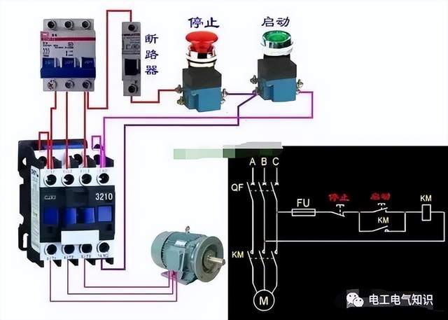 接触器自锁电路图还有很多元件,比如热继电器,熔断器,指示灯等等,今天主要讲解自锁接线,如果原件太多可能不好理解,所以把接触器的元件去掉,只讲接触器自锁。 380伏接触器自锁主触头接线上方三个接三相电源,下方接负载端,线圈A1跟接触器L1联通也就是线圈A1长带电,我们通过控制接触器线圈A2电源来达到控制接触器的目的,电源L3经过断路器或者熔断器到了停止按钮,停止按钮我们要接常闭触点,也就是一直联通的,然后电源到了启动按钮常开点,启动按钮常开点出来到了接触器辅助触头上方,又跟接触器线圈A2联通如图然后启动按钮常开上线又分出一根线到了接触器辅助触头下方,这根线是很重要的,因为停止按钮我们接的是常闭,不按它就是一直联通的,所以辅助触头下方是常带电的。 下面我们说一下原理 我们按下启动按钮,启动按钮常开变为常闭,所以电源通过辅助触头上方到了线圈A2处,这时线圈A1和A2形成了380伏电源,所以接触器开始吸合,接触器上下触点联通,电动机开始运转,但是我们松开启动按钮,启动按钮又会变为常开,也就断电了,接触器不能正常运行,这时接触器辅助触头下方触点长带电的就起作用了。 因为我们按下启动按钮时接触器已经吸合,辅助触头也已经吸合,所以辅助触头下方电源也开始给线圈A2送电,所以启动按钮松开,辅助触头下方还在送电,这样接触器就形成了自锁,而我们按下停止按钮,电源断电接触器断开,所以辅助触头下方电源也就不起作用了,这就是接触器自锁的原理。 明白了实物接线以后我们再看电路图就很容易理解了,右方是接触器自锁电路图,ABC分别电表三相火线电源,QF开关,KM是接触器,FU是熔断器,KM带个方口就是接触器线圈电源,按钮的位置,连在一起的是要接常闭,分开的是要接常开,圆圈M 是负载电动机,根据实物接线图再结合自锁电路图! |