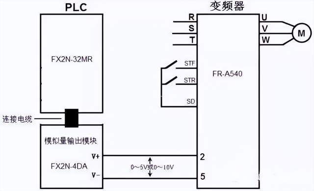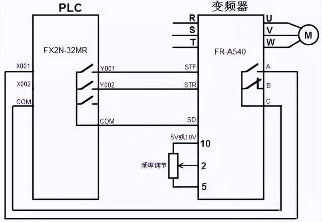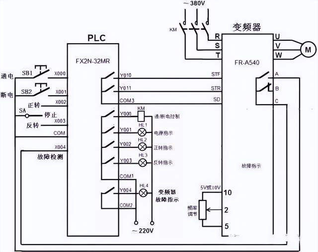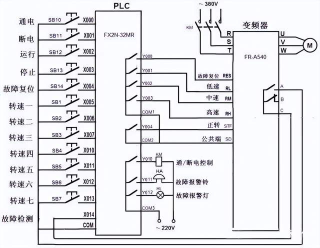 PLC与变频器两者是一种包含与被包含的关系,PLC与变频器都可以完成一些特定的指令,用来控制电机马达,PLC是一种程序输入执行硬件,变频器则是其中之一。 但是PLC的涵盖范围又比变频器大,还可以用来控制更多的东西,应用领域更广,性能更强大,当然PLC的控制精度也更大。变频器无法进行编程,改变电源的频率、电压等参数,它的输出频率可以设为固定值,也可以由PLC动态控制。 PLC是可以编程序的,用来控制电气元件或完成功能、通信等任务。 PLC与变频器之间通信需要遵循通用的串行接口协议(USS),按照串行总线的主从通信原理来确定访问的方法。总线上可以连接一个主站和最多31个从站,主站根据通信报文中的地址字符来选择要传输数据的从站,在主站没有要求它进行通信时,从站本身不能首先发送数据,各个从站之间也不能直接进行信息的传输。 PLC基本结构图 PLC可编程控制器的存储器可以分为系统程序存储器、用户程序存储器及工作数据存储器等三种。 1、系统程序存储器 系统程序存储器用来存放由可编程控制器生产厂家编写的系统程序,并固化在ROM内,用户不能直接更改。系统程序质量的好坏,很大程度上决定了PLC的性能。 其内容主要包括三部分:第一部分为系统管理程序,它主要控制可编程控制器的运行,使整个可编程控制器按部就班地工作,第二部分为用户指令解释程序,通过用户指令解释程序,将可编程控制器的编程语言变为机器语言指令,再由CPU执行这些指令;第三部分为标准程序模块与系统调用程序。 2、用户程序存储器 根据控制要求而编制的应用程序称为用户程序。用户程序存储器用来存放用户针对具体控制任务,用规定的可编程控制器编程语言编写的各种用户程序。 目前较先进的可编程控制器采用可随时读写的快闪存储器作为用户程序存储器,快闪存储器不需后备电池,掉电视数据也不会丢失。 3、工作数据存储器 工作数据存储器用来存储工作数据,既用户程序中使用的ON/OFF状态、数值数据等。在工作数据区中开辟有元件映像寄存器和数据表。其中元件映像寄存器用来存储开关量、输出状态以及定时器、计数器、辅助继电器等内部器件的ON/OFF状态。数据表用来存放各种数据,它存储用户程序执行时的某些可变参数值及A/D转换得到的数字量和数字运算的结果等。 变频器基本结构图 变频器是把工频电源(50Hz或60Hz)变换成各种频率的交流电源,以实现电机的变速运行的设备,其中控制电路完成对主电路的控制,整流电路将交流电变换成直流电,直流中间电路对整流电路的输出进行平滑滤波,逆变电路将直流电再逆变成交流电。对于如矢量控制变频器这种需要大量运算的变频器来说,有时还需要一个进行转矩计算的CPU以及一些相应的电路。 PLC与变频器一般有三种连接方法: ①利用PLC的模拟量输出模块控制变频器PLC的模拟量输出模块输出0~5V电压信号或4~20mA电流信号,作为变频器的模拟量输入信号,控制变频器的输出频率。这种控制方式接线简单,但需要选择与变频器输入阻抗匹配的PLC输出模块,且PLC的模拟量输出模块价格较为昂贵,此外还需采取分压措施使变频器适应PLC的电压信号范围,在连接时注意将布线分开,保证主电路一侧的噪声不传至控制电路。 ②利用PLC的开关量输出控制变频器。PLC的开关输出量一般可以与变频器的开关量输入端直接相连。这种控制方式的接线简单,抗干扰能力强。利用PLC的开关量输出可以控制变频器的启动/停止、正/反转、点动、转速和加减时间等,能实现较为复杂的控制要求,但只能有级调速。 使用继电器触点进行连接时,有时存在因接触不良而误操作现象。使用晶体管进行连接时,则需要考虑晶体管自身的电压、电流容量等因素,保证系统的可靠性。另外,在设计变频器的输入信号电路时,还应该注意到输入信号电路连接不当,有时也会造成变频器的误动作。例如,当输入信号电路采用继电器等感性负载,继电器开闭时,产生的浪涌电流带来的噪声有可能引起变频器的误动作,应尽量避免。 ③PLC与RS-485通信接口的连接。所有的标准西门子变频器都有一个RS-485串行接口(有的也提供RS-232接口),采用双线连接,其设计标准适用于工业环境的应用对象。单一的RS-485链路最多可以连接30台变频器,而且根据各变频器的地址或采用广播信息,都可以找到需要通信的变频器。链路中需要有一个主控制器(主站),而各个变频器则是从属的控制对象(从站)。 PLC的变频器控制电机正反转接线图 1.按接线图将线连好后,启动电源,准备设置变频器各参数。 2.按“MODE”键进入参数设置模式,将Pr.79设置为“2”:外部操作模式,启动信号由外部端子(STF、STR)输入,转速调节由外部端子(2、5之间、4、5之间、多端速)输入。 3.连续按“MODE”按钮,退出参数设置模式。 4.按下正转按钮,电动机正转启动运行。 5.按下停止按钮,电动机停止。 6.按下反转按钮,电动机反转启动运行。 7.按下停止按钮,电动机停止。 8. 若在电动正转时按下反转按钮,电动机先停止后反转;反之,若在电动机反转时按下正转按钮,电动机先停止后正转。 PLC与变频器的接线图 PLC和变频器通讯方式: 1、PLC的开关量信号控制变频器 PLC(MR型或MT型)的输出点、COM点直接与变频器的STF(正转启动)、RH(高速)、RM(中速)、RL(低速)、输入端SG等端口分别相连。PLC可以通过程序控制变频器的