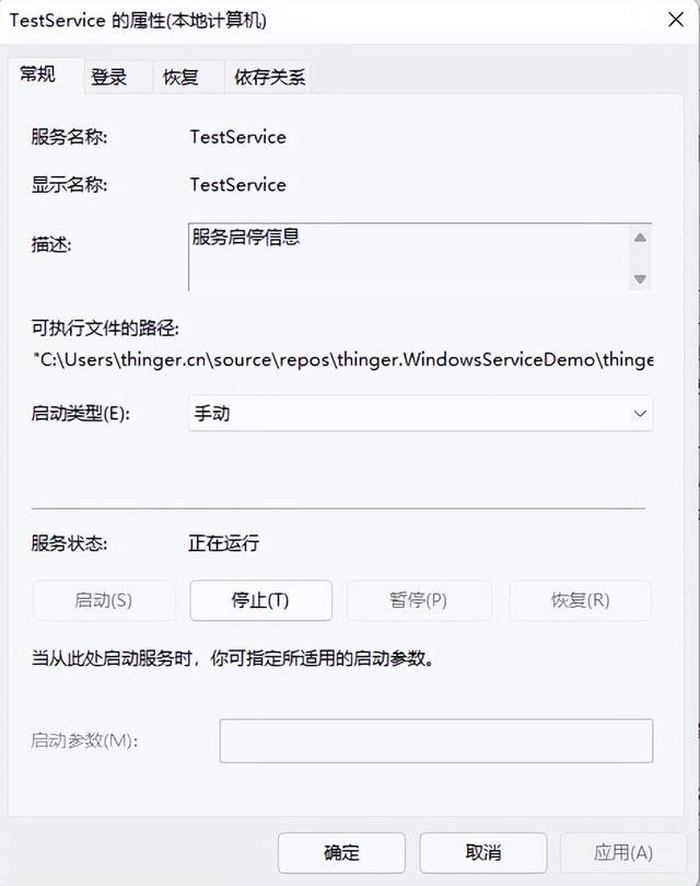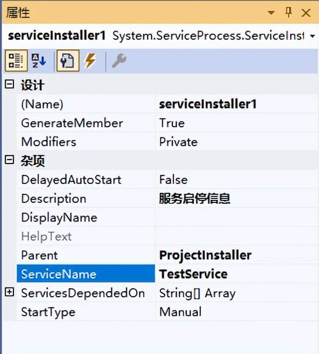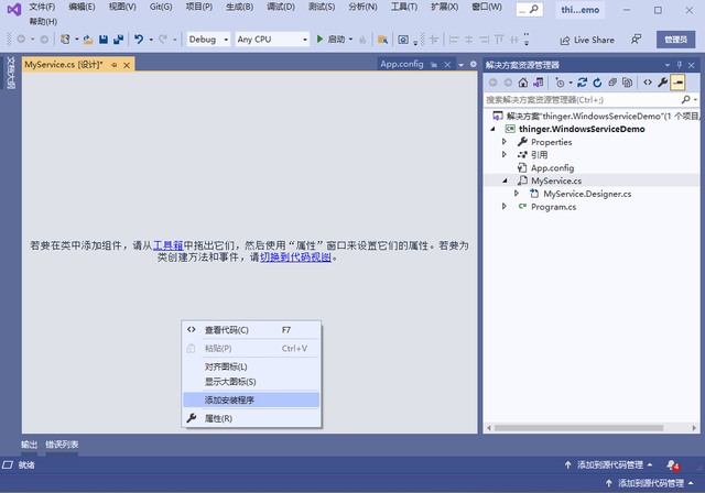 前言在实际应用过程中,有时候我们希望开发的程序,不需要界面,直接开机就可以长时间运行,这时候,我们可以考虑做成一个Windows服务。 这篇文章跟大家介绍一下,如何基于C#实现Windows服务的创建、安装、启动、停止和卸载。 Windows服务介绍Microsoft Windows 服务能够创建在它们自己的 Windows 会话中可长时间运行的可执行应用程序。这些服务可以在计算机启动时自动启动,可以暂停和重新启动而且不显示任何用户界面。这使服务非常适合在服务器上使用,或任何时候,为了不影响在同一台计算机上工作的其他用户,需要长时间运行功能时使用。还可以在不同于登录用户的特定用户账户或默认计算机账户的安全上下文中运行服务。 创建Windows服务1、创建一个新项目,项目类型选择Windows服务,如下图所示: 2、项目名称修改为thinger.WindowsServiceDemo,创建完成界面如下所示: 3、为了方便区分,将类名Service1改成MyService。 4、在设计界面,右击鼠标,会出现如下弹窗,选择添加安装程序,并点击添加安装程序。 5、点击添加安装程序之后,会自动添加一个ProjectInstaller界面,里面有两个组件,分别是serviceProcessInstaller和serviceInstaller。 6、先选择serviceInstaller进行属性设置,主要可以设置以下属性: